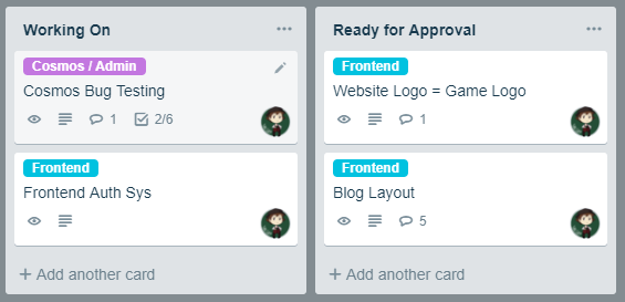 We move cards(Tasks) between each of these lists so we know what stage every task is in, each of the cards are labeled to give a clear indication of the urgancy of the task and the focus. Finaly developers are added to the cards so it is clear who is working on what.